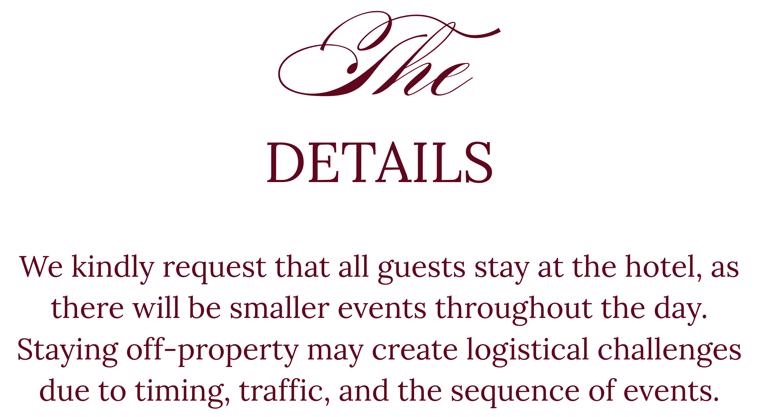 If you wish to arrive earlier or extend your stay, please feel free to contact the hotel directly to arrange additional nights at the preferred wedding rate (subject to availability).